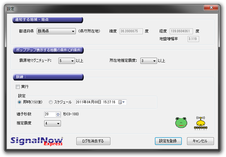 6.設定では、自分が住んでいる県、震源地マグニチュード、現在地推定震度を