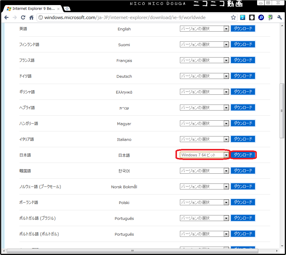 私の場合はWindows 7 64 ビットなのでそれを選択し、ダウンロードをクリック。