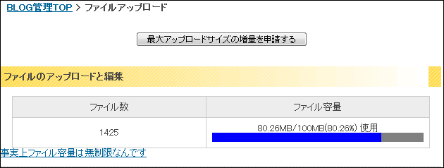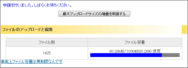 使用容量が85%を越えた場合、容量を100MB増やせる追加申請ボタンが出現します。